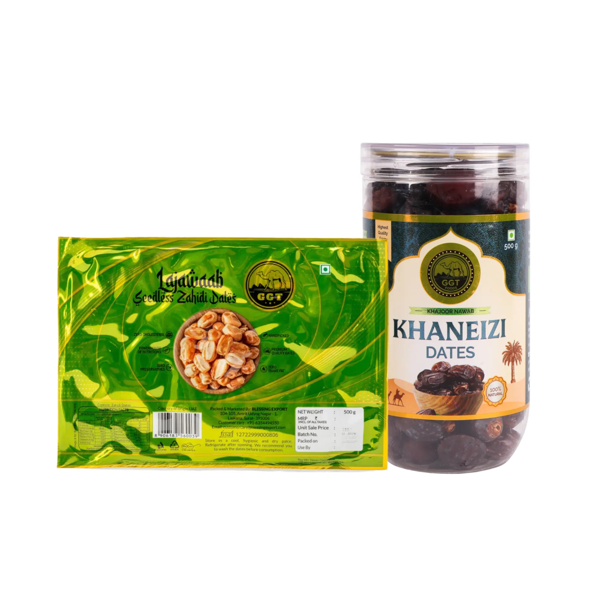Includes: Khaneizi Dates Jar 500gm + Seedless Zahidi Dates Pouch 500gm
