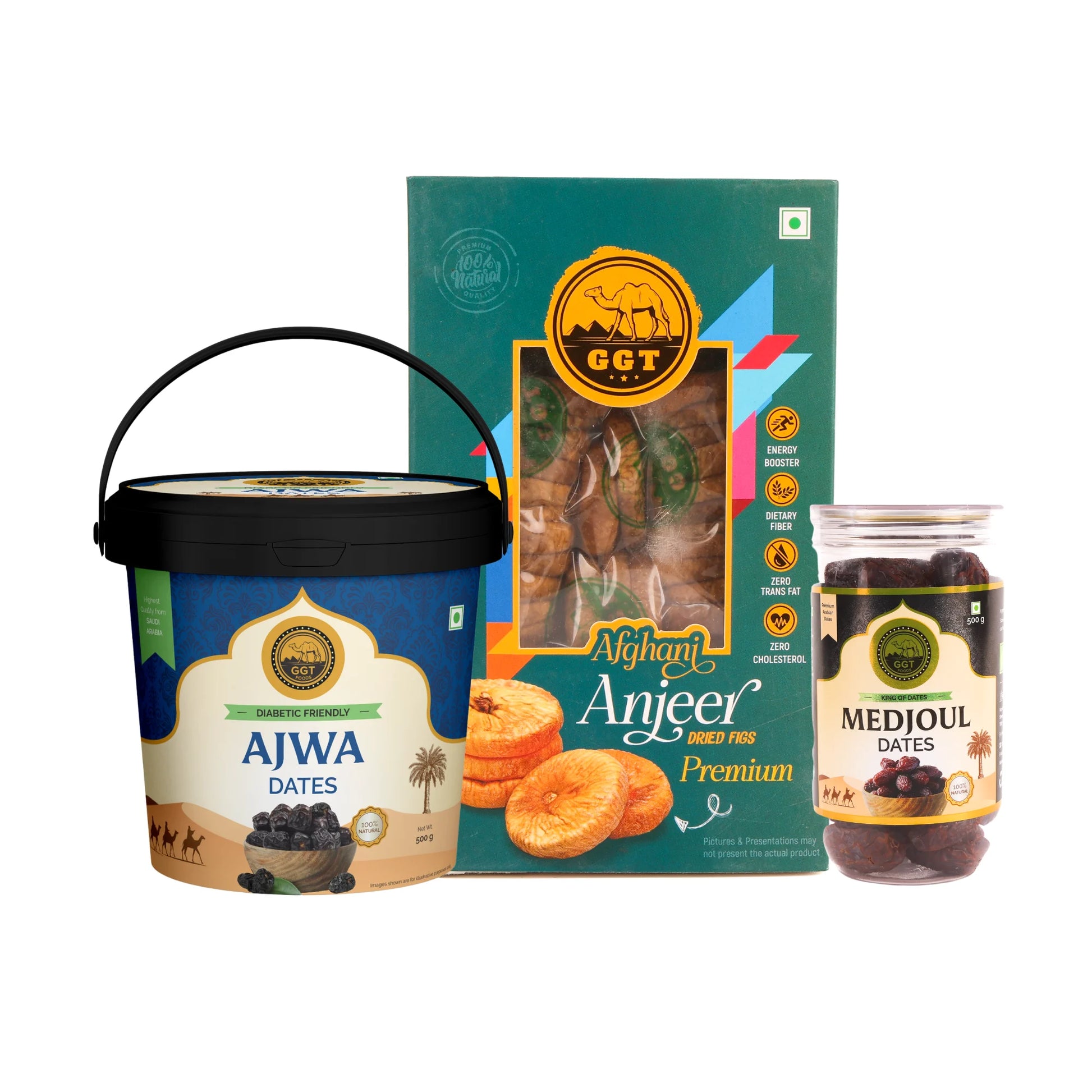 Includes: Medjoul Dates 500gm + Ajwa Dates 500gm + Premium Afghani Anjeer 250gm