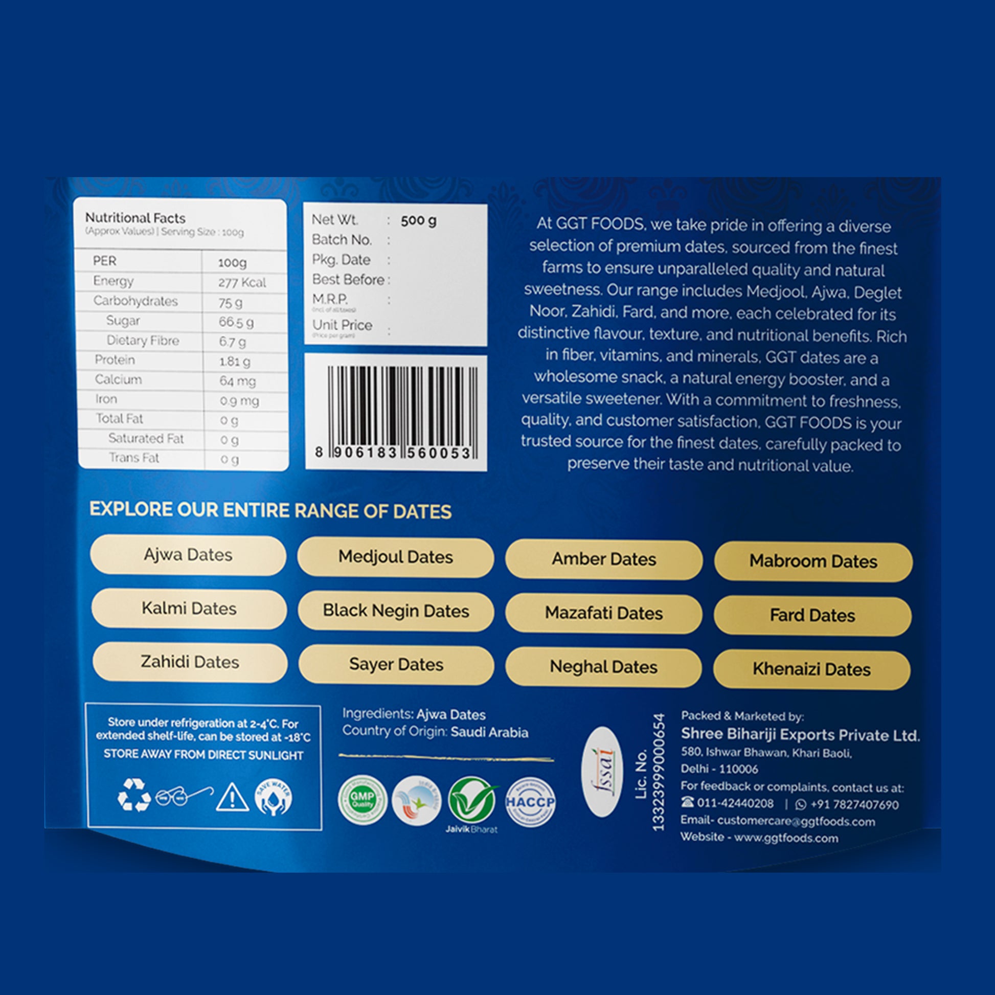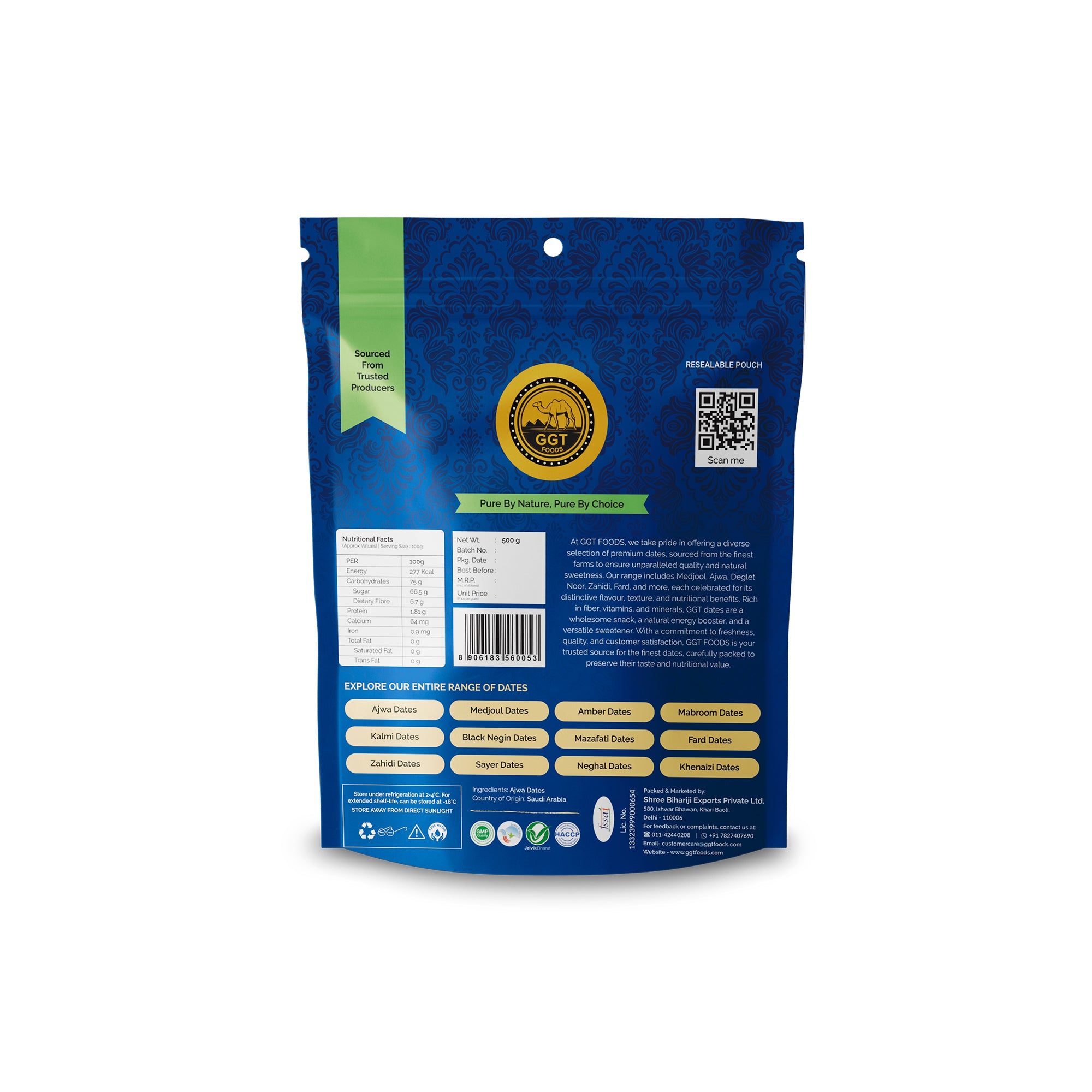 Get the exquisite taste of Ajwa Dates with our premium GGT Ajwa Dates. Renowned for their rich flavour, soft texture, and nutritional benefits, these Ajwa Dates are perfect for daily consumption or special occasions. Packed in a convenient bucket, they offer a natural sweetness that is both delicious and wholesome.