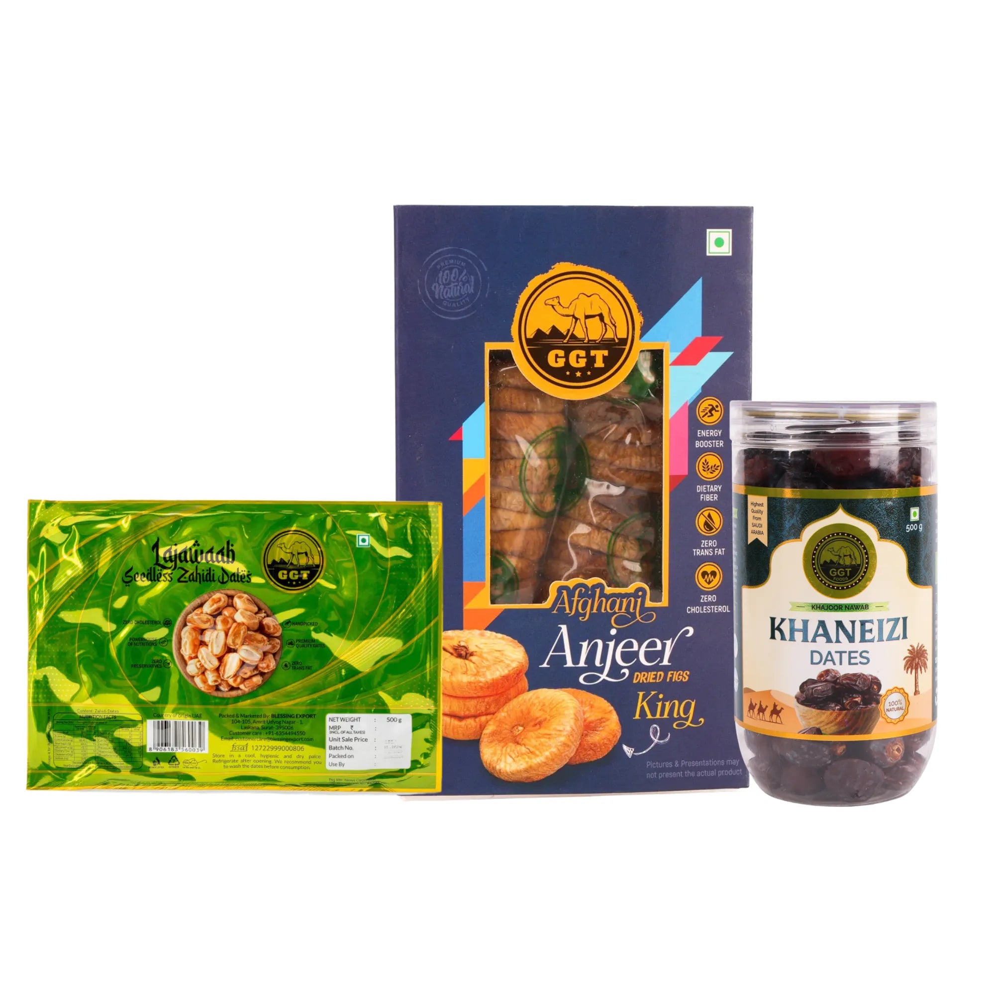 Includes: King Afghani Anjeer 250gm + Seedless Zahidi Dates 500gm + Khaneizi Dates 500gm