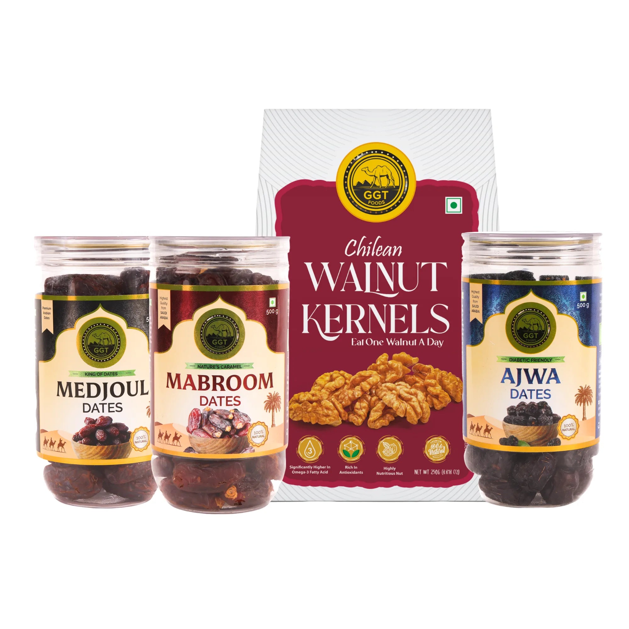 Includes: Walnuts 250gm + Medjoul Dates 500gm + Mabroom Dates 500gm + Ajwa Dates 500gm